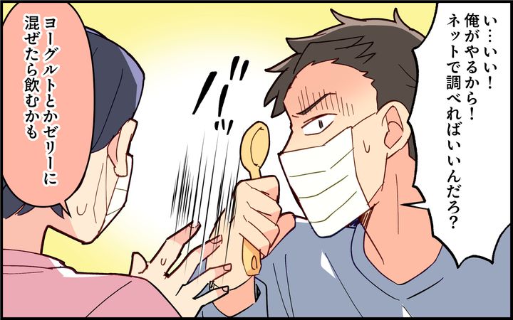 いつも子どもが病気になると妻に任せて出社している雄太。しかしインフルエンザが妻にもうつってしまい、仕方なく子どもたちを病院に連れていくことに。仕事の合間に苦戦しながら病院に連れて行ったのに、妻がオムツや着替えを入れ忘れていて思わぬ苦労をすることに。さらに息子に薬を飲ませようとしてやり方を尋ねると、妻から「人任せ」だと責められてしまう。忙しい合間に手伝っているのに文句を言われた雄太は不満を溜めるのだった。