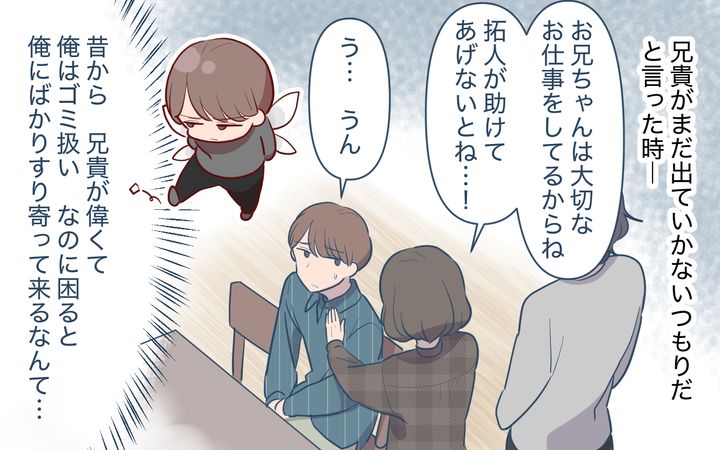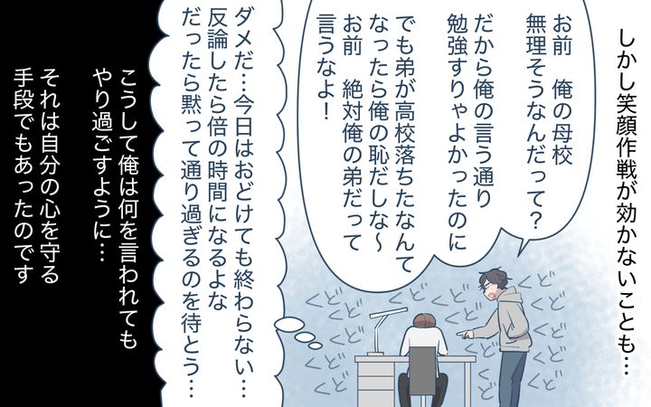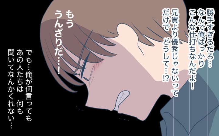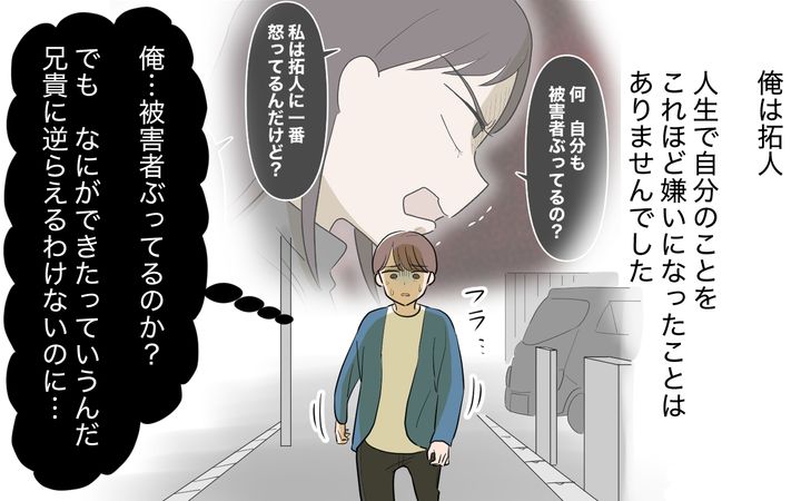 俺は心のどこかでずっと「自分は家族に虐げられるかわいそうな被害者」だと思ってきました。俺を見下し、命令し、自分たちの都合の良いように使う母と兄。でも俺が反論したところで、説教は長くなり、マウントはひどくなるだけでした。だから俺は反論するよりも、いかにその苦痛を和らげることができるかを考えるようになりました。