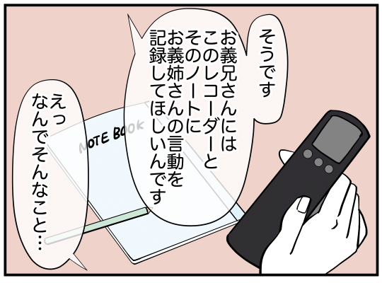 義兄にレコーダーとノートを渡し、義兄嫁の言動を記録するように勧めたライコミさん。“義兄嫁に自分の姿を認識してもらう”とともに、“怒りの根源を探る”という名目ですが、義兄に不信感も抱いていて…。