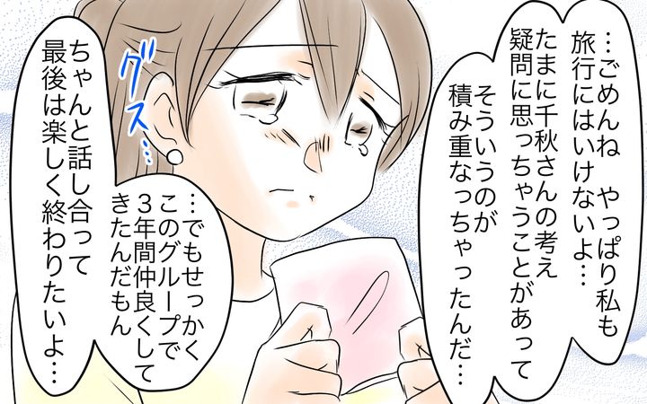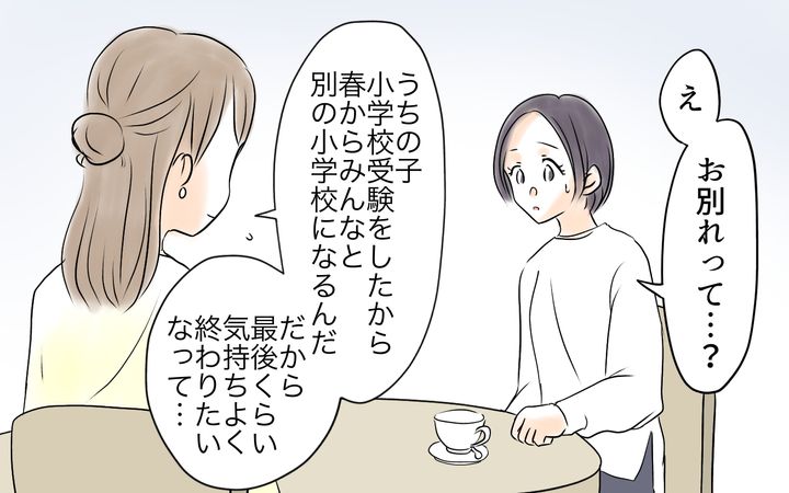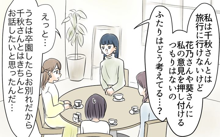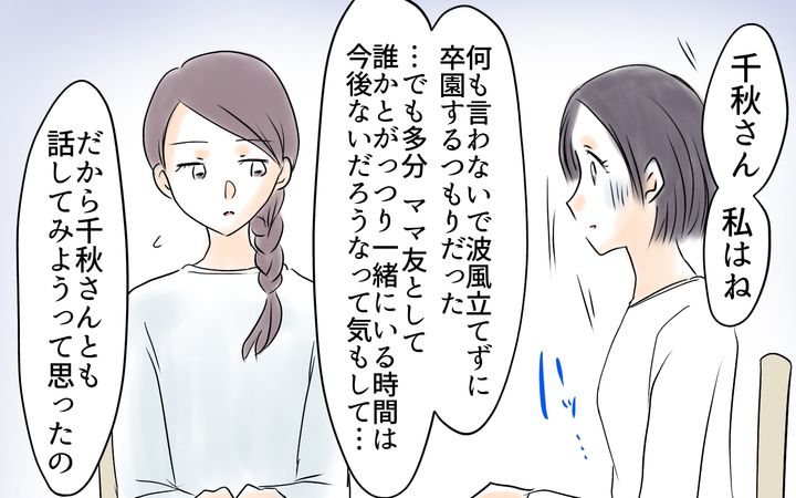 余裕のない生活で僻みっぽくなっていた千秋は、自分の飲食分を友人たちに負担してもらうことも、幼稚園の担当の仕事ができないことも仕方ないことだと思っていた。しかし子どもNGの店で行われた打ち上げに子どもを連れて行った後、ママ友たちからの連絡が減ってしまう。クリスマスや新年会も行わず、卒園イベントの企画の話も持ち上がらない。このため自ら提案した千秋だったのだが、ママ友の真子から参加を断られてしまう。