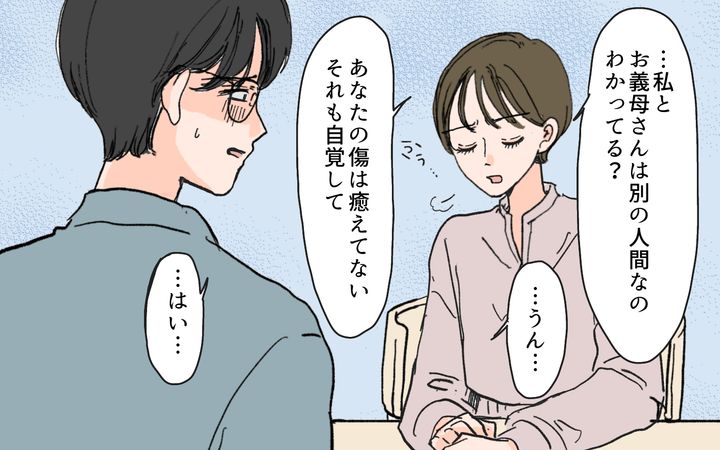 さすがにもう一緒にはいられない、と考えていると、義母から呼び出され、過去に義母の行動によって女性に対して不安になっているという事実を聞く。義母から謝られたものの、まずは夫と話をすることに。