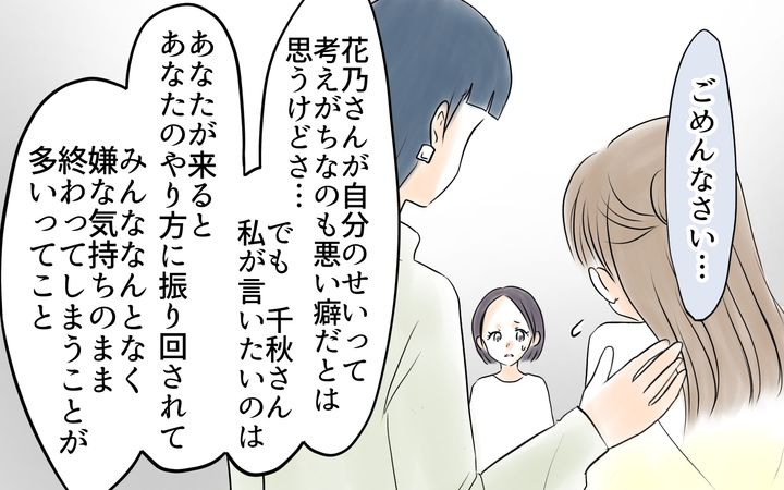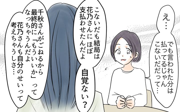 何かにつけて「ズルい」「自分ばかり」と考えてしまう千秋。店で自分が多く注文しても割り勘にしたり、役員の仕事を任せきりにしたりしていた。ママ友の食事会では、子どもお断りの店に自分の子を連れて行き、さらに子ども分まで割り勘にしようとする始末。しかしその後、ママ友たちは恒例のイベントも卒園旅行の企画も誘われなくなり…。