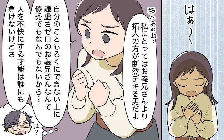 拓人はお義兄さんやお義母さんに逆らうことをすっかり諦めてしまっているのは、すごくモヤモヤするし、正直「もっとしっかりしろ!」と強く言いたい気持ちがあります。でも拓人は、綾音のことはとても大切にしてくれるし、お義兄さんたちさえ絡まなければ、私のことも大事にしてくれる優しい夫。