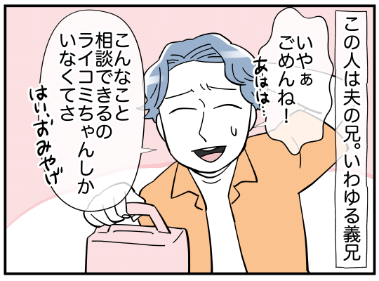 休日一人の時間を満喫しようと思っていたライコミさんのもとを、単身で訪れた義兄。わざわざ好きなケーキを手土産にするあたり悪い人ではなさそうですが、話の内容は相談というより愚痴ばかり。