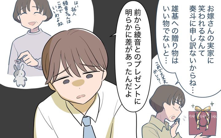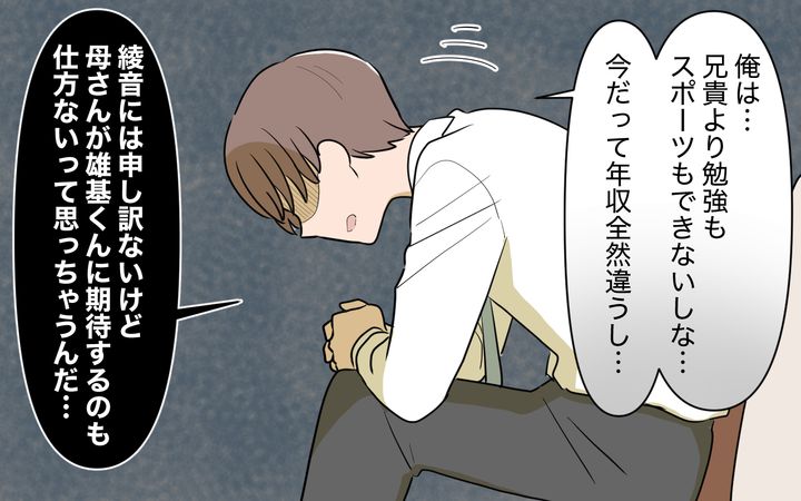 でもお義母さんの中で、雄基くんは将来が期待できる優秀な子、綾音は可愛いけれど将来はない子と勝手に判断されていたことにショックを受けました。そしてそれは親の優劣で勝手に判断し、綾音自身には何も関係ないことでした。
