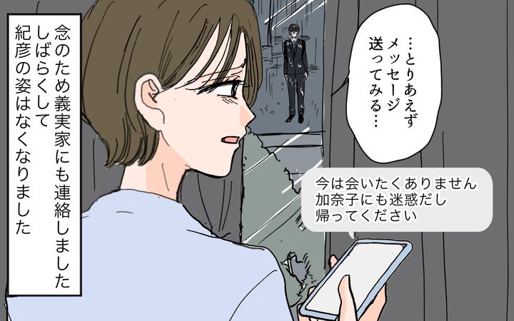 ずぶ濡れの夫にメッセージが届いたのかどうかはわかりません。恐怖のあまり夫のほうを見れずにいると…しばらくして、夫の姿はなくなりました。