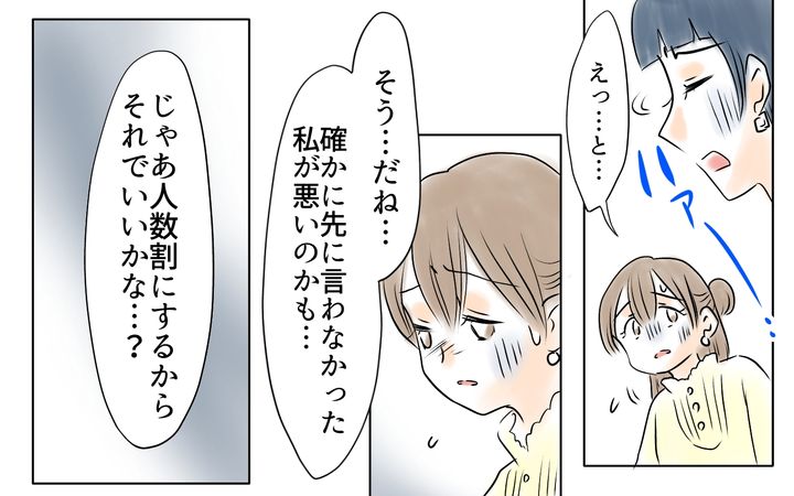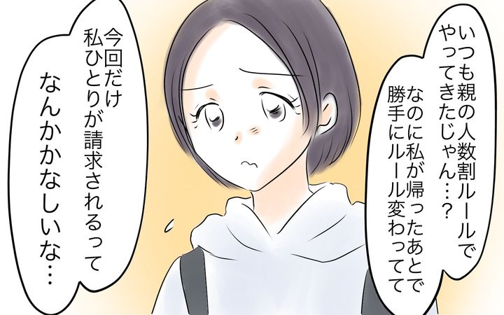 これまでの集まりでは、子どもが何人いても全体の金額から親の人数で割っていました。それは子どもがひとりでもふたりでも関係なく…。今回はたまたま我が家だけが子ども連れでしたが、本来ならそれは親の人数、今回で言えば4で割るべきはず。それなのに私ひとりだけが負担となるのはおかしいことだと思ったのです。