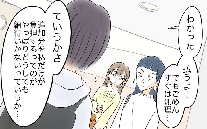 結局花乃さんがそのことに気づいてくれて負担してくれることに。花乃さんの家は余裕があるし、結果的に真子さんや葵さんも支払いを請求されなかったのだから私に感謝してくれてもいい気がするのですが…。とはいえ当初の金額よりも高くなってしまったことには変わりなく…。手持ちがなかった私はもう1日支払いを延ばしてもらったのです。