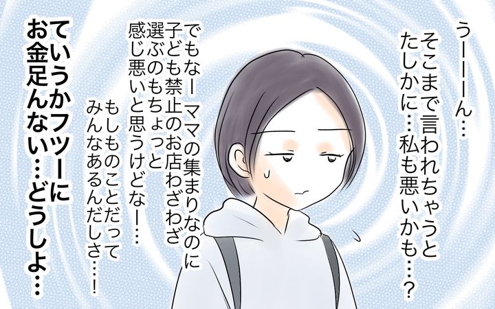 自分ばかり夫を頼れず、家計も厳しく不幸だと思い込んでいる千秋。子連れ禁止の食事会に参加しようとしたが、夫がでかけてしまったため、子どもたちを連れて行く。子どもたちは店内で走り回り、食べ終わるとすぐに店から出されてしまった。翌日子どもが食べた分も請求された千秋は理不尽だと言い張り、店にクレームを入れて代金を返してもらおうと提案する。しかし花乃の夫の知り合いの店だったため、花乃は「これ以上あのお店に迷惑かけられない」と千秋を止めるのだった。