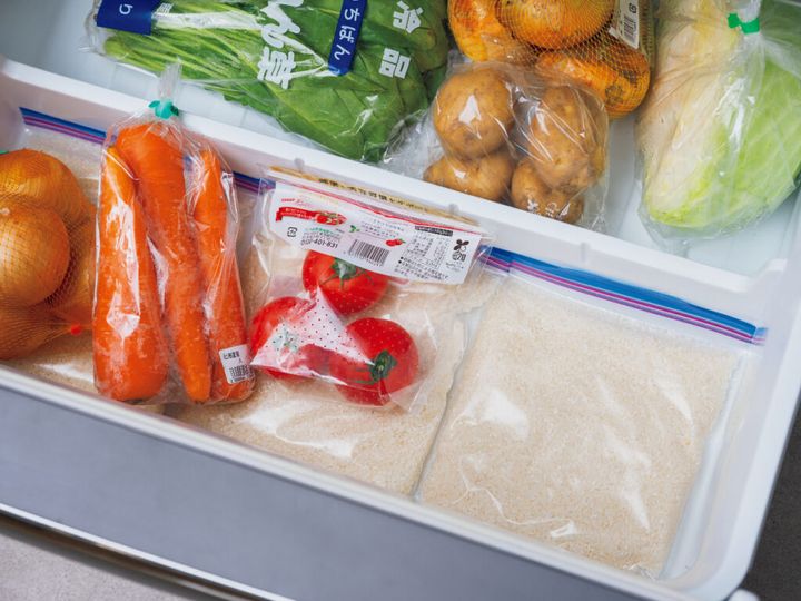 米袋のまま入れると、重さがかたよって引き出しがゆがむ場合もあるので、保存袋に小分けにし、引き出しの底へ。炊飯1回分ずつ量っておけば、使うときも便利! お米の上に野菜をのせても、もちろんOKです。