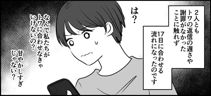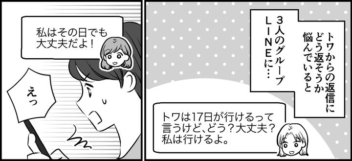 トワからの返信にどう返そうかと悩んでいると、3人のグループLINEにシオリとナオコから「17日でもOKだよ」とメッセージがきました。2人ともトワの返信の遅さや既読スルーの謝罪がなかったことには触れず、トワの言ってきた17日に予定を合わせる流れのようです。
