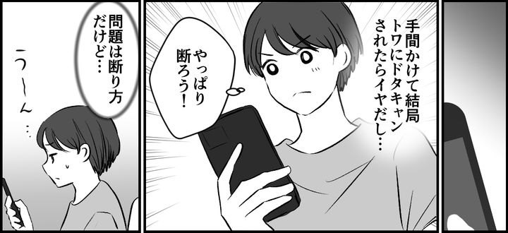 これまで、トワには何度かドタキャンされたこともあります。もし今回も、私がお店に日時の変更をしたり、手間をかけて、結局トワにドタキャンされたら? イヤだな。そう思い、私は参加を諦めることにしました。問題は断り方です。私はシオリとナオコと会うのは毎年の楽しみでもあったので、できれば今後も付き合い続けたいと思っています。