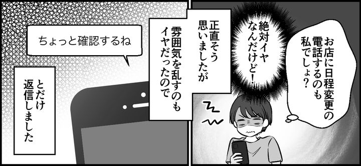しかし私は、「なぜ既読スルーを続けていたトワに予定を合わせなければならないのか」と不満があり、ドタキャンされるかもしれないのにトワに合わせて予約を変更するのもイヤだと感じてしまいます。