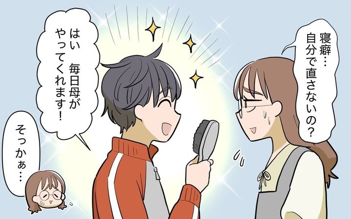 瑛介に寝癖を直してほしいと言われて、戸惑う千秋。夫も過保護すぎないか…?と気がつきます。