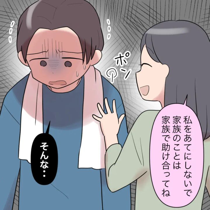 ずっと家に居て稼ぎもなく暇だから家族全員の世話と家事を全てやるのは当たり前と言われたり、子ども達の塾代のために、甘えていないで外で働けと言われる私。働き始めたら今度は家のことが手抜きだとユウタに文句を言われて、この家の人たちの身勝手さに呆れてしまいました。「家族が困っているのを助けるのは当たり前」と言われたので、ようやく私は結婚当初に義母から「この家であなただけが家族じゃない」と冷たく言われたことをユウタに伝えると、「母さんそんなこと言ったの?」とユウタは驚いていました。