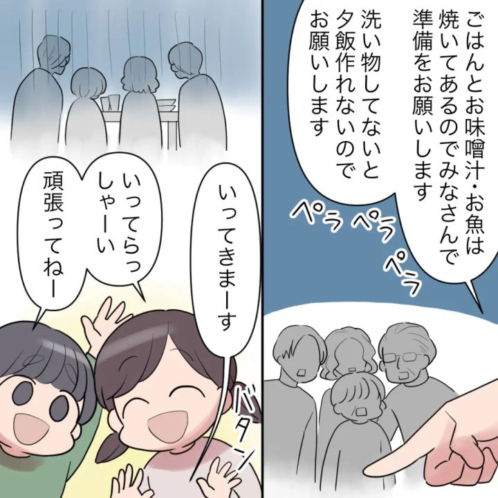 結婚と同時に義父母、義姉と完全同居になったカエデ。仕事を辞めて義実家に入った妊婦のカエデのからだを労わることなく、義家族はそれぞれの勝手な都合に合わせてカエデをお手伝いさんのように扱うのに、夫ユウタは妻を庇うどころか家族側につき、「家族で一番暇」「寄生しているだけ」「働いていないのに生活してる」などと心無い言葉を浴びせるのでした。そして子ども達を就学前に塾へ通わせることになると、今度は「そろそろ働いたら?」「甘えてないで塾代くらい稼いで」と本当に自分勝手。自分をなんだと思っているのだろうとあらためて思ったカエデの中で、何かが途切れた瞬間でした。カエデは仕事を探し、必要最低限の家事以外はするのをやめました。カエデに押し付けていた家事を義母がまたしなくてはならなくなったり、自分の都合でいいように使っていたカエデに拒否されるようになると、ユウタはカエデに「家族が困っているんだから助け合うのが普通」と言いましたが、この時とばかりにカエデは結婚した時に義母から「この家で家族でないのはあなただけ。ルールに従わなければ出て行ってもらう」とハッキリ言われたことを伝えたのでした。