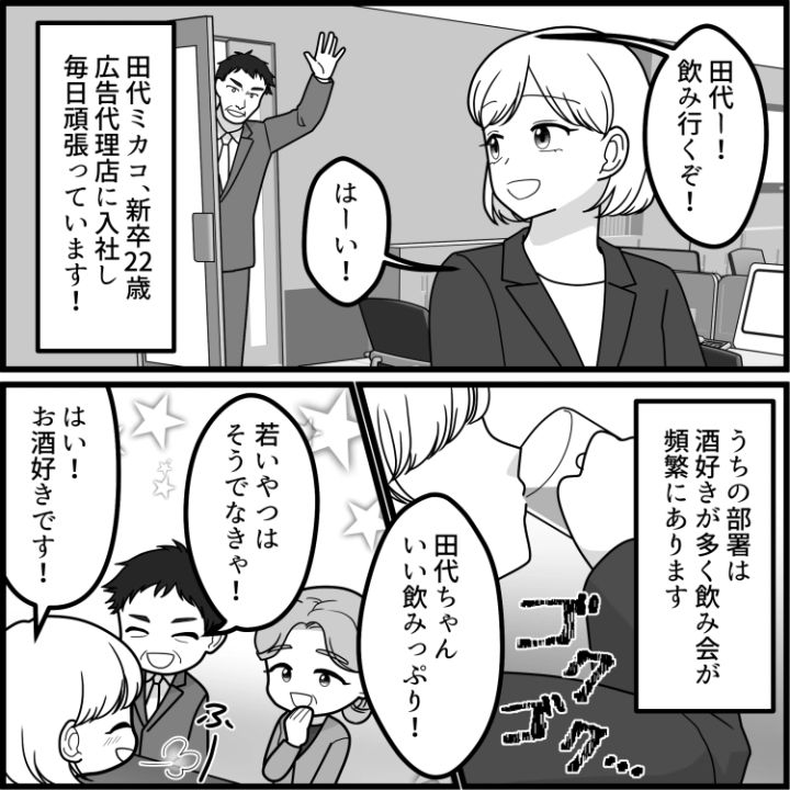 広告代理店の新入社員として奮闘しているミカコ。入社した部署はお酒好きな人が多く、頻繁にチームでの飲み会が開かれており、ミカコもお酒を楽しんでいた。