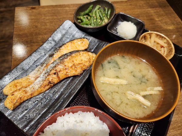 家族が注文した「銀鮭塩焼き定食」(1,188円)が運ばれてくると、テーブルは炉端焼きの香ばしい香りに包まれました。