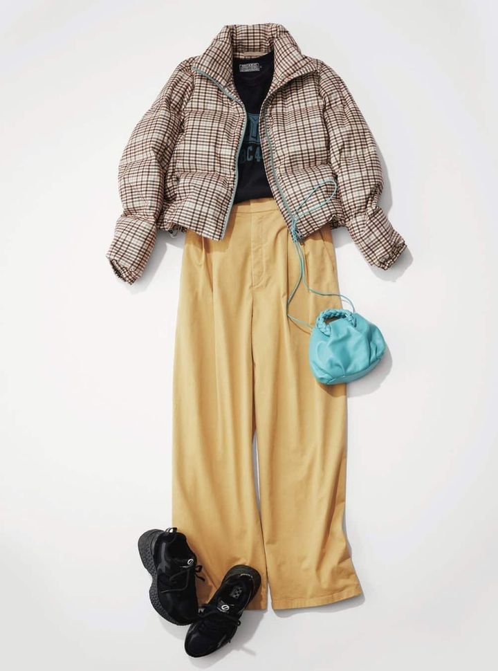 コンパクトなチェック柄ダウンで視線を上にキュッと集めることで、無条件に足長見え。キャッチーカラーのパンツと合わせることで、ハイウエストの切り替えも引き立ちます。メリハリが良い、大人のカジュアルに。