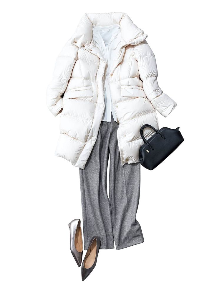 着膨れしそう、メリハリがなくなりそう、子供っぽくなりそう…そんなダウンコーデの悩みを一気に解決してくれるのが、コンパクトなショート丈ダウン。ワイドパンツのラインも際立つので、細見え&足長見えします。白ならより上品に。