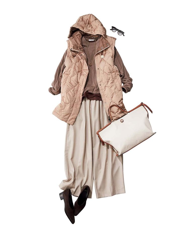 お尻まで隠れる丈のダウンベストは、パンツのトーンをそろえて縦ラインを繋げるのがコツ!長めのダウンも、明るいカラーを選べば重くならずドレッシーな印象に!ダウンは、スリーブを付けられる2Wayデザイン。