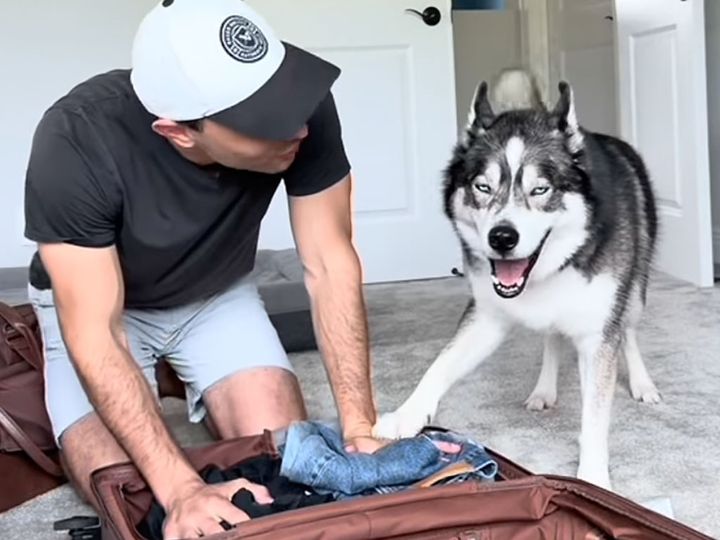 3. 荷造りなんて許さない! 旅行準備を全力で止めるハスキーさんの“アゥアゥ抗議”が可愛い