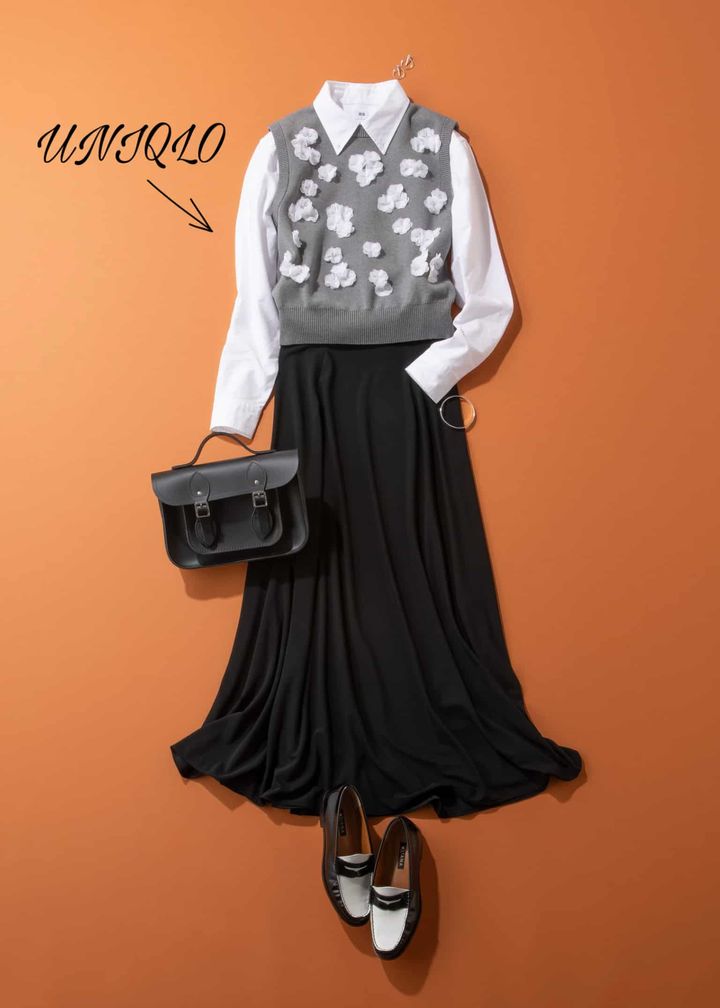 オックスフォードシャツ¥2,990※メンズアイテム(ユニクロ)ベスト¥24,200(ユナイテッドアローズ)バッグ¥39,600(ケンブリッジ サッチェル)シューズ¥29,700(ダイアナ)ピアス¥88,000<ウノアエレ>バングル¥12,100<ワンエーアールバイウノアエレ>(すべてウノアエレ ジャパン)