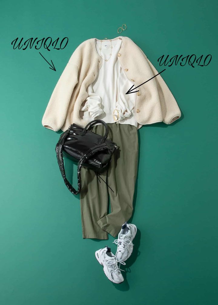 ボアフリースリラックスカーディガン¥3,990スウェットシャツ¥2,990(すべてユニクロ)バッグ¥37,400(ヴァジック/ヴァジックジャパン)シューズ¥12,980(ニュー バランス/アトモス ピンク)ピアス¥110,000ネックレス¥267,300<ともにウノアエレ>バングル¥12,100<ワンエーアールバイウノアエレ>(すべてウノアエレ ジャパン)