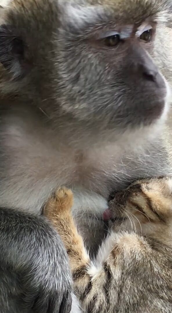 なんと、その子供は子猫だったのです! 子猫はサルのお母さんにかなり懐いているようで、夢中になってミルクを飲んでいるようです。