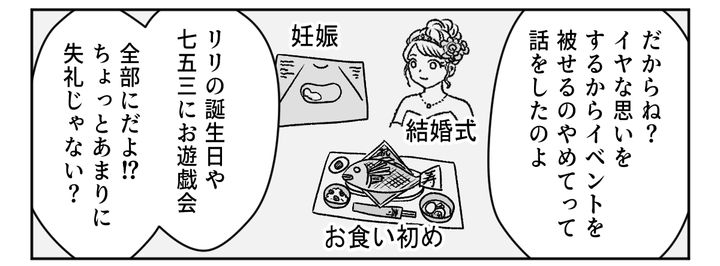 私は旦那と4歳になる娘のリリと3人で暮らしています。旦那の弟夫婦(義弟・ライ、義妹アンジュ)がリリのイベントに、なにかと自分たちのイベントを被せてくるのです。今回もアンジュちゃんがお食い初めに指定してきた日は、リリのお遊戯会。義両親も誘ってそのまま食事に行く約束をしていました。それなのにしれっと「お食い初めにきてください」はおかしいのではないでしょうか。電話をしたら「じゃあお食い初めができるレストランに変更しましょう」なんて言うけれど、どうしてもともと予定が決まっていたうちが、アンジュちゃんの子どものお食い初めに合わせなければならないのでしょうか。