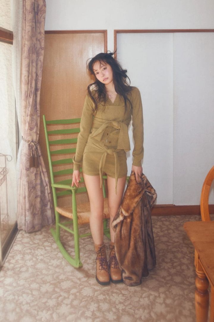 ニットカーディガン 29,700円、ニットショーツ 22,000円、ヘアリボン 18,700円/以上LEINWANDE ファーコート 63,800円/ジャッキー(ジャック・オブ・オール・トレーズ)ネックレス 15,400円/ete ブーツ 13,900円/チャールズ&キース(チャールズ&キース ジャパン)