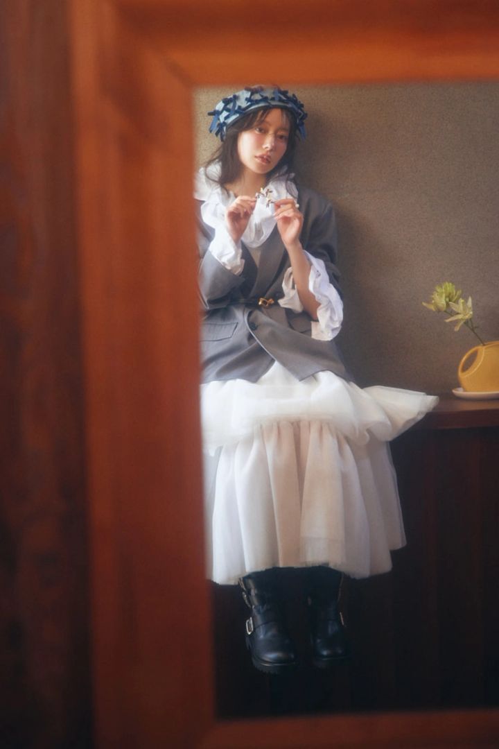 ジャケット 23,100円、エンジニアブーツ 34,100円/ともにレイ ビームス、リング 30,250円/サスキア ディーズ(以上レイ ビームス新宿)フリルブラウス 35,200円/MIYAO チュールスカート 13,860円/Carmelo(アンティローザ)リボンハット 35,200円/ブランク(H3O ファッションビュロー)ベルト 11,000円/ブリー レオン(ジャック・オブ・オール・トレーズ)シアーソックス/スタイリスト私物