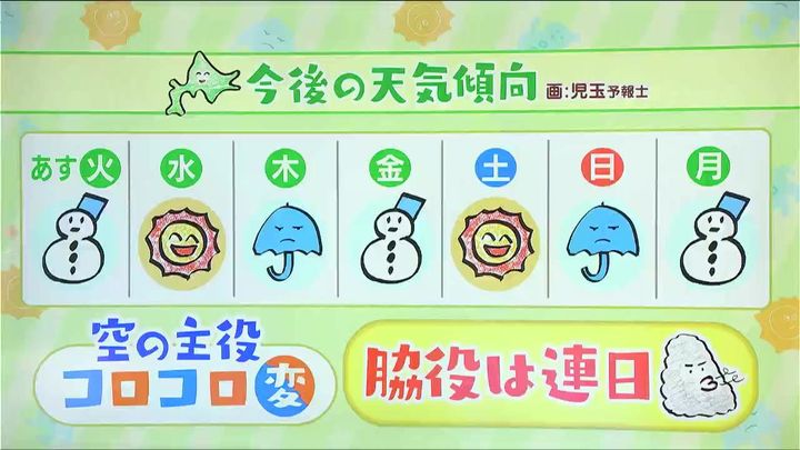 ただ、太陽君、傘くん、雪だるま君が空の主役争いで揉めています。今後の道内、日ごとに空の主役、天気が変わりそうです。