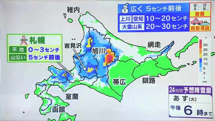 再び上空の寒気が強まっています。あす11日(火)にかけて道内は雪が降ります。こちらはあす午後6時までの24時間に降る雪の量です。日本海側を中心に広く5センチ前後の雪が降り、上川の幌加内周辺、空知の夕張周辺、後志の山沿いで10~20センチ、大雪山系では20~30センチです。湿った雪による着雪や路面状況の変化に注意して下さい。札幌は土曜日のような雪にはなりませんが、うっすら白くなるおそれがあるので、路面凍結に注意して下さい。