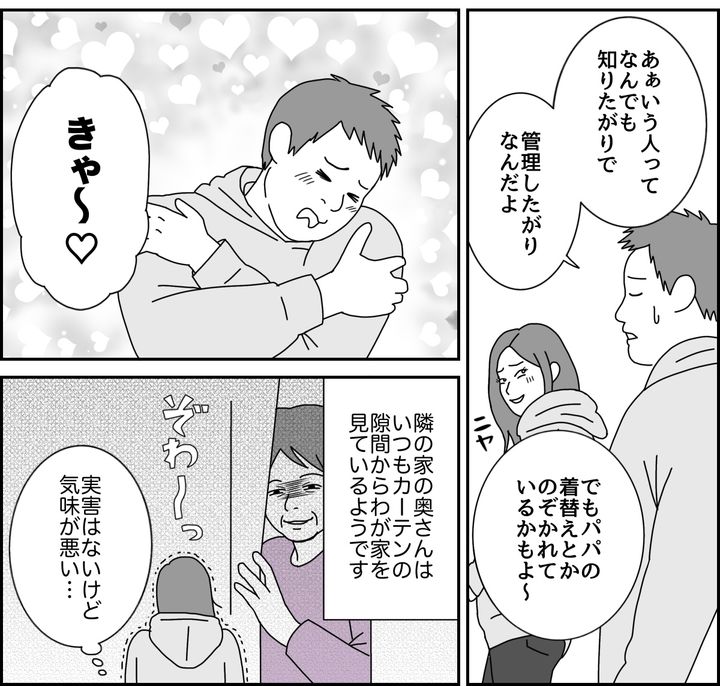 隣の家の奥さん、いつもカーテンの隙間からわが家を見ているようです。最初に見かけたときはかなりのホラーでした。実害がないので放っておきましたが、気分がいいものではありません。庭の木の枝を切るように言いに行ったら、ご近所付き合いについてクドクド言ってきました。