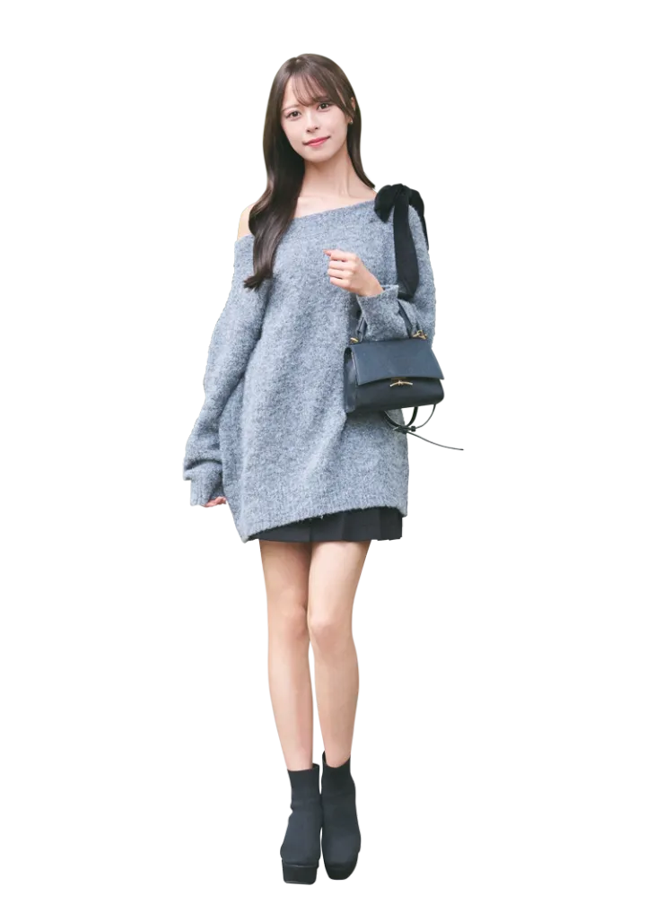 韓国で約2,000円で買ったプリーツスカートとあわせてガーリー要素をプラス。肩と脚をW見せする本気コーデ♡