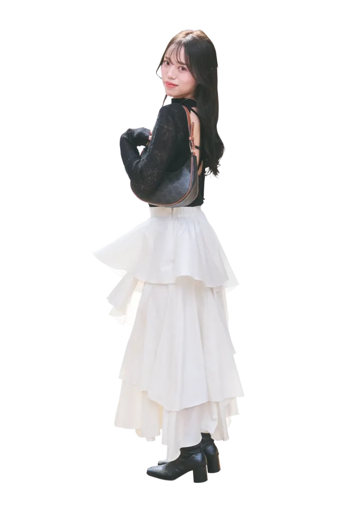 「背中見せが特徴的なトップスはSNIDELで約8,000円。ティアードが可愛いロングスカートはFRAY I.Dで約20,000円。