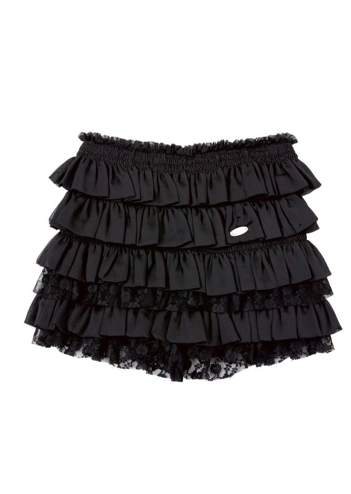【上から】トレンドのユニホームTにロマンティックムードをミックス。Tシャツ¥8,768、リッチなティアード仕様。裾からのぞくレースにキュン♡ レイヤードしても可愛い。スカパン¥8,768/ともにイリゴ(HANA SHOWROOM)