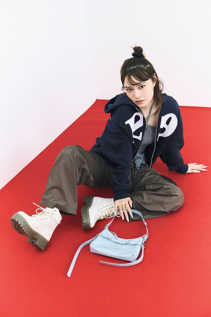 パーカ¥8,972、ベアトップ ¥5,505、パンツ¥8,564/すべてイリゴ、バッグ¥14,410/アルキアルカ(以上すべてHANA SHOWROOM)、リング¥2,970/アネモネ(サンポークリエイト)、ブーツ¥30,800/ティンバーランド(VF ジャパン)、シュシュ¥4,950/heyep