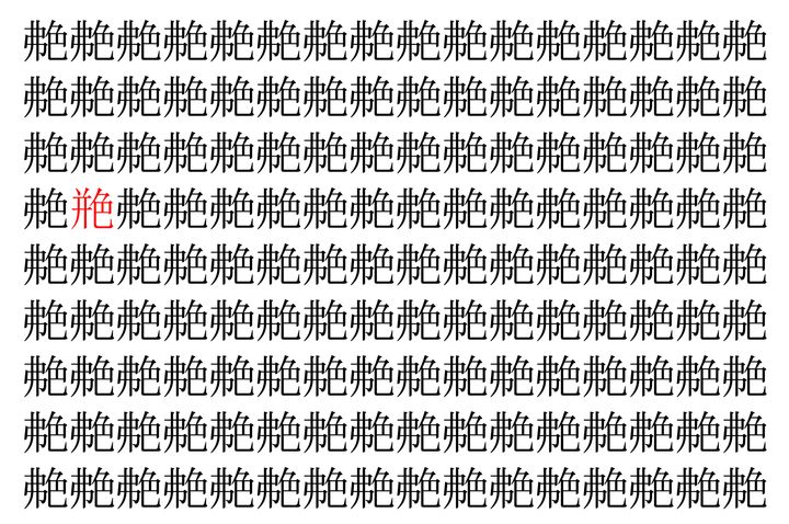 画像の中には、「艴」という漢字が縦に9行、横に16個並んでいます。 全部で144個となりますが・・・、そのうち1つは「異なる漢字」となってますよ!!