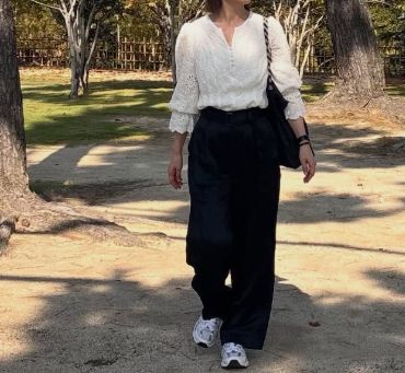 2. 着こなしが洗練見えの秘訣。白シャツ×黒パンツで楽しむ大人のフレンチシック【40代の毎日コーデ】