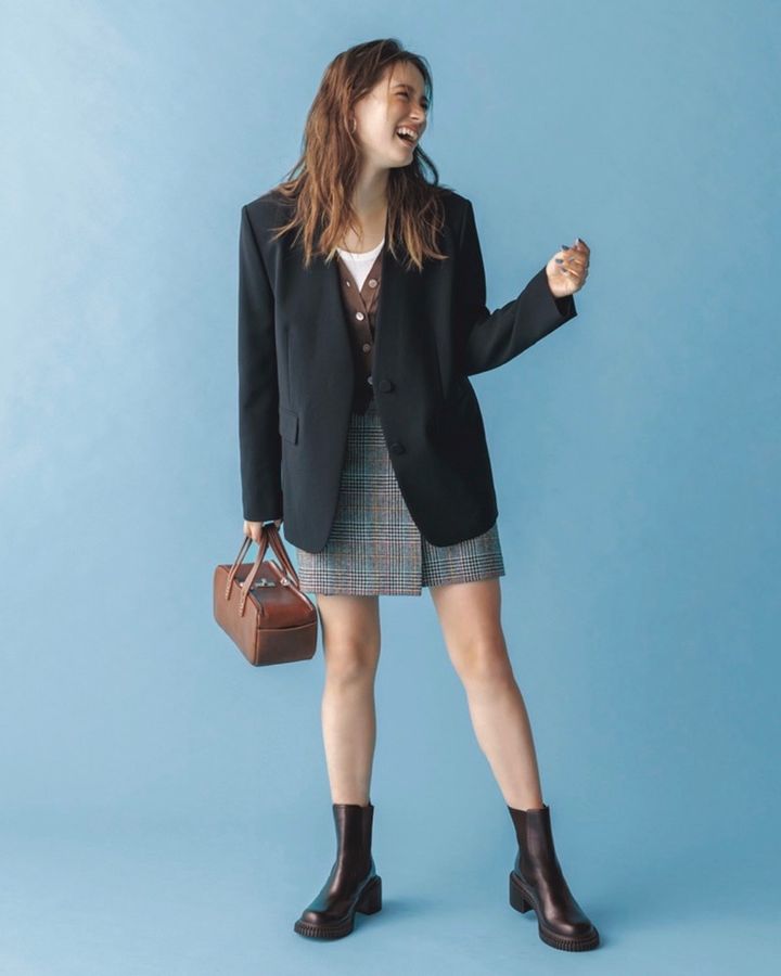 ジャケット¥63,800〈ルル・ウィルビー〉タンクトップ¥8,800(イレーヴ)カーディガン¥37,400(スローン× デミルクス ビームス/デミルクス ビームス新宿)スカート¥50,600(ブルックスブラザーズ/ブルックス ブラザーズジャパン)ピアス¥33,000(アガット)バッグ¥58,300(ア ヴァケーション/ノーベルバ)ブーツ¥39,600(カンペール/カンペールジャパン)