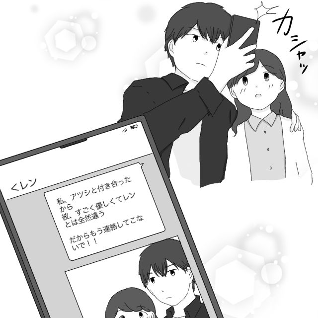 そして、おもむろにカメラを向けると無言で自分と私の写真を撮り、「私、アツシと付き合ったから。彼、すごく優しくてレンとは全然違う。だからもう連絡してこないで!!」という文章とともにツーショット写真を添付してレンに送信。