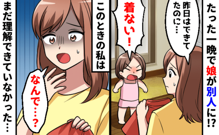 このあと、なんとか冷静さを取り戻した私は、娘自身に服を選んでもらって着替えをすることができました。しかし、この日から娘は私の選んだ服を着てくれなくなり、食事中も、食後の歯磨きも、すべてが容易に進まなくなりました。いつも通りにしたい私と、いつも通りがイヤになってしまった娘。一晩眠っただけで、こんなにも変わってしまうのかと驚きました。