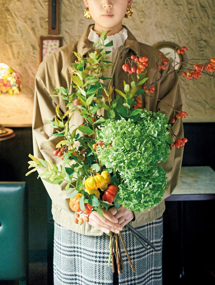 『ル・ベスべ』の松岡龍守さんが選んでくれた今月の花は、枝先に小さなオレンジの実をぶら下げたスズバラ。アンティークグリーンの大ぶりな花が美しいアナベル、かぼちゃのような実のソラナム パンプキン、葉が赤くなり始めた紅葉ヒペリカムを合わせて、秋の訪れを感じさせるブーケに。「一足早く季節が進む、寒冷地の北海道から届いたスズバラ。花の後に実がついてから出荷されるので、切り花よりもひと手間かかって店頭に並びます。バラですからトゲがあるし、枝が長くて重たい(笑)。きっと生産が大変だろうと想像すると、大切に飾らないと、と思うんです」 (ル・ベスべ 03−5469−5438) ブルゾン¥481,800、シャツ¥184,800、キュロットパンツ¥402,600、イヤリング¥137,500(以上サンローラン バイ アンソニー・ヴァカレロ/サンローラン クライアントサービス 0120−95−2746)