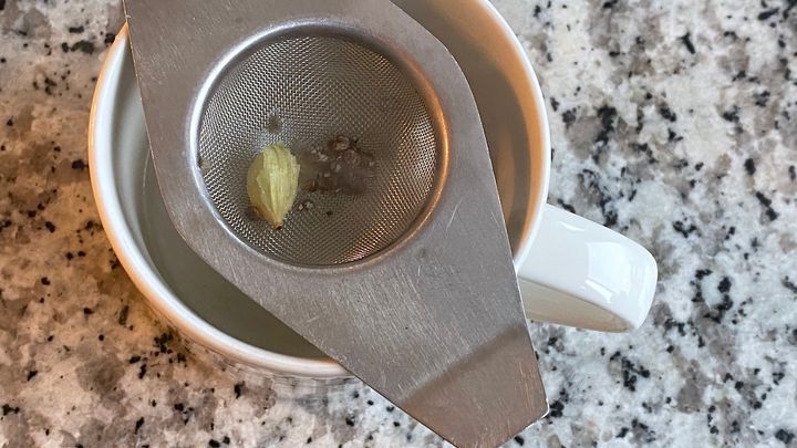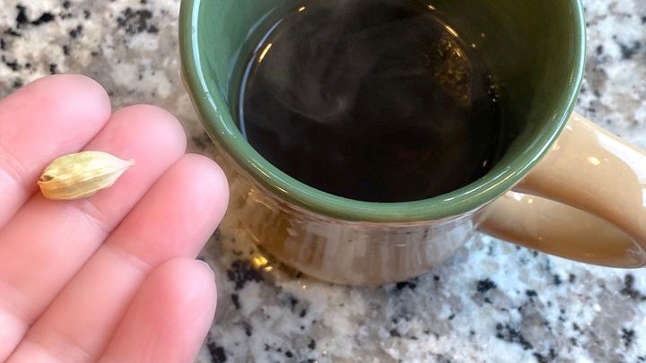 カルダモンを砕いてコーヒーカップに入れ、コーヒーを注ぐ