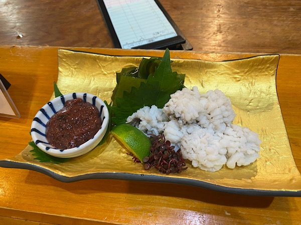 ハモ湯引き(980円) 訪問したのが夏だったのでハモが出ていました。梅肉も酸っぱすぎず甘すぎず、ハモによく合いました。