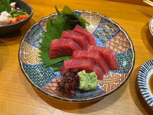 本マグロ赤身造り(880円) 厚みのある赤身にもほんのり脂が乗っています。