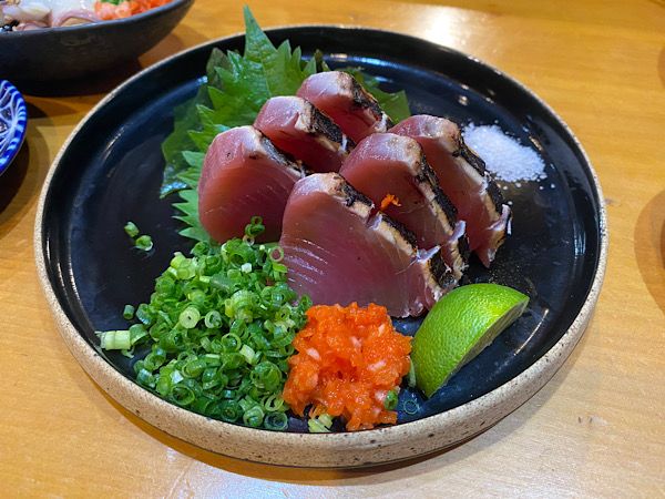 カツオ炙り造り(780円) 鮮度の良いカツオは塩で食べるのが一番。甘味のあるニガリの塩との相性が抜群でした。