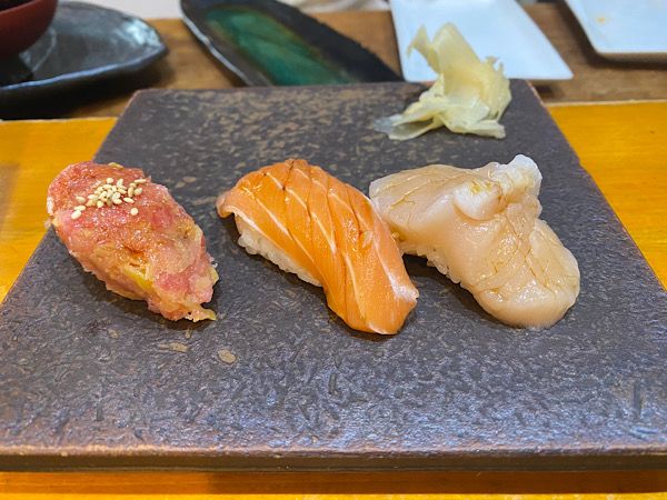 お寿司 左からネギトロにぎり(380円)、サーモン(280円)、帆立(330円) 先に醤油はついているのでこのままいただけます。